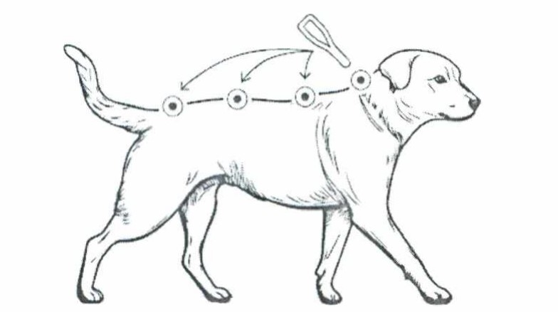 • у собак в одну (в случае небольшого объёма пипетки) или в несколько точек вдоль позвоночника от основания черепа до хвоста, не допуская попадания препарата на шерсть.